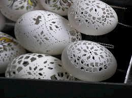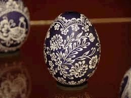 Engraving, an alternative method, requires the egg to be dyed first. The pattern is then engraved on with a knife. According to how deeply the surface is scratched, a deeper or paler color is revealed. A simple but effective method is to boil onion skins in water; boiling the eggs in this gives them a lovely dark brown color. They are then rubbed with bacon rind skin to give them a sheen.
