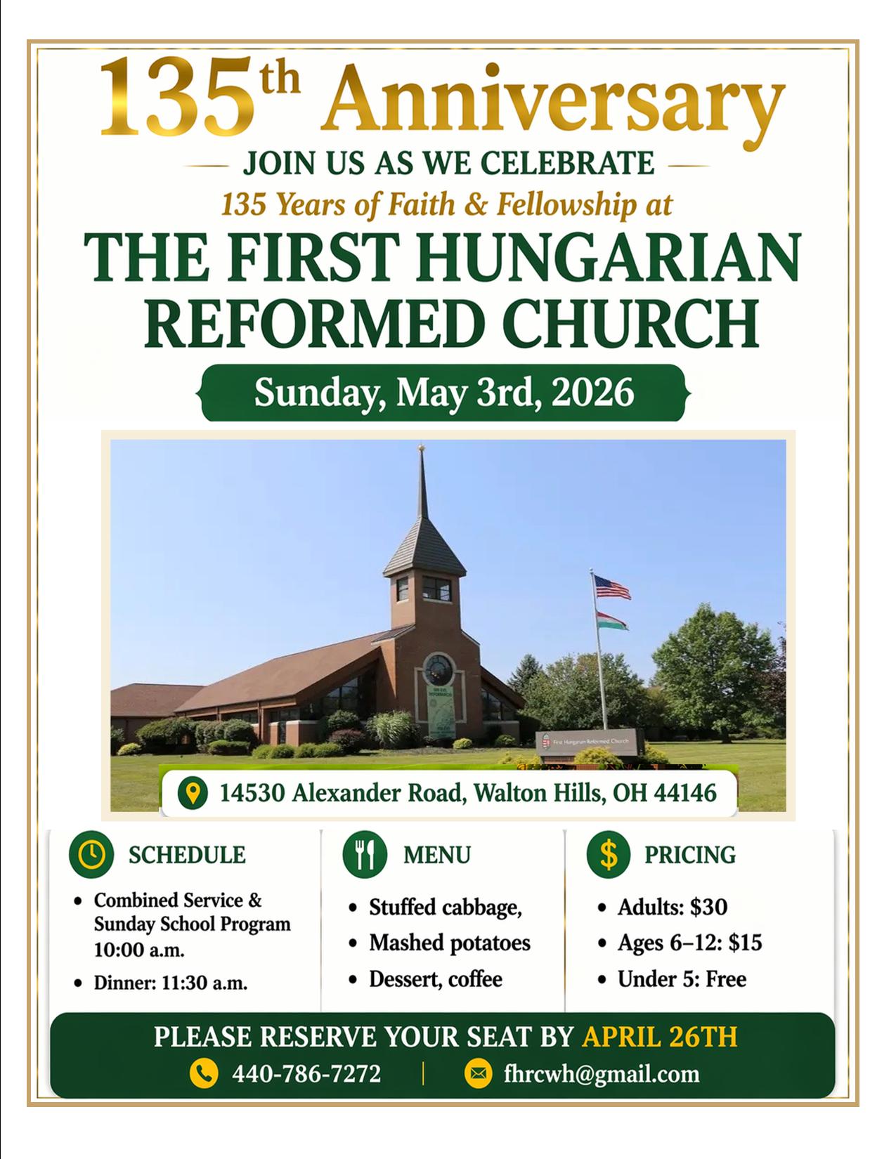 Join us on May 3rd at 10:00 a.m. for a special worship service celebrating the 135th anniversary of our church, followed by a dinner in the Bethlen Hall. Together we will give thanks for the blessings of the past 135 years and seek God’s continued guidance for our congregation.
