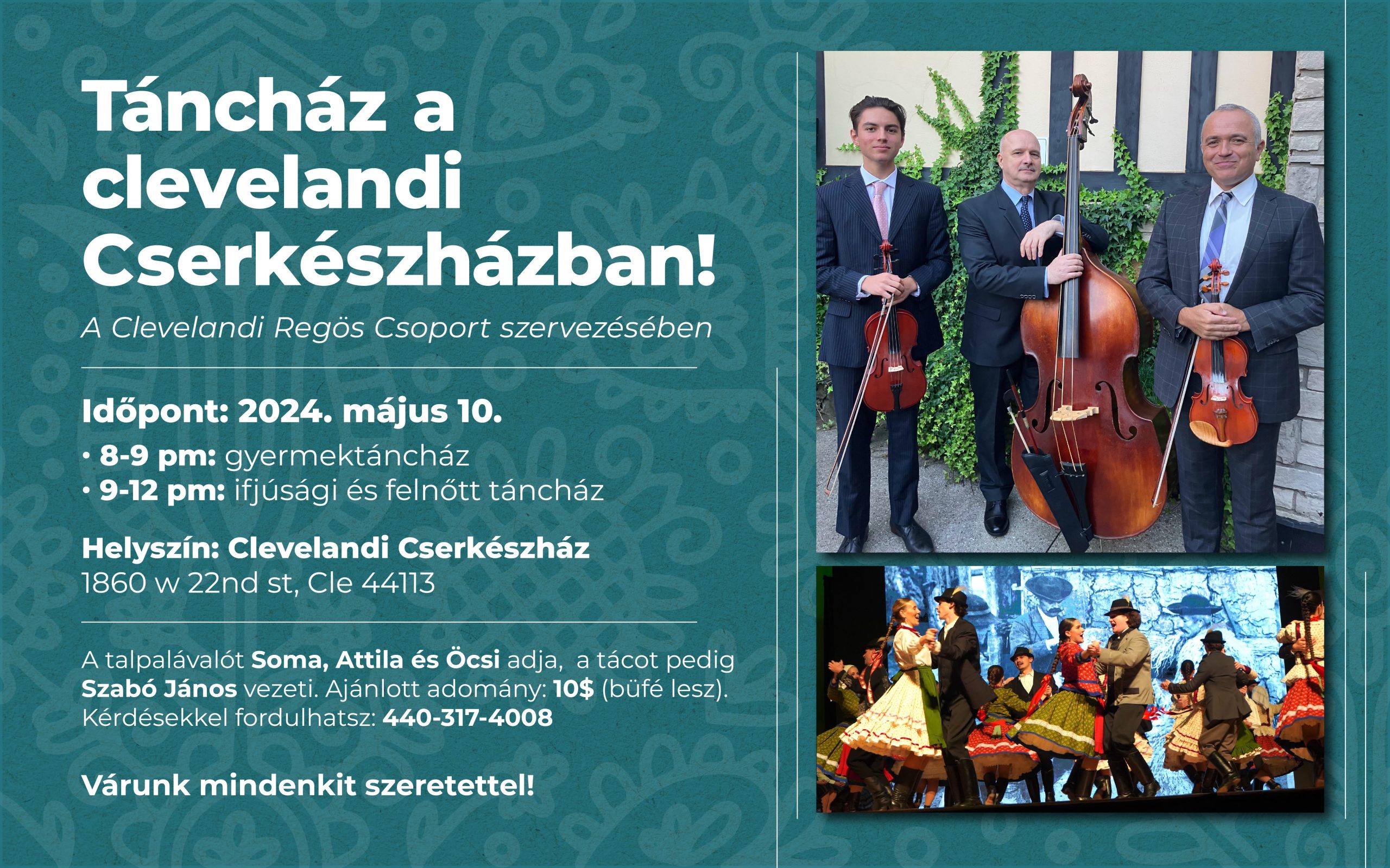 A Clevelandi Regös Csoport szeretettel hív és vár mindenkit május 10-én tartandó táncházba. Este 8-tól a gyerekek majd 9-től ifjúsági és felnőtt táncház. A talpalávalót ifj. Magyar Kálmán és bandája szolgáltatja, míg a táncot Szabó János vezeti. Helyszín a clevelandi Cserkészház, mely címe: 1860 W.22nd st. OH 44113.