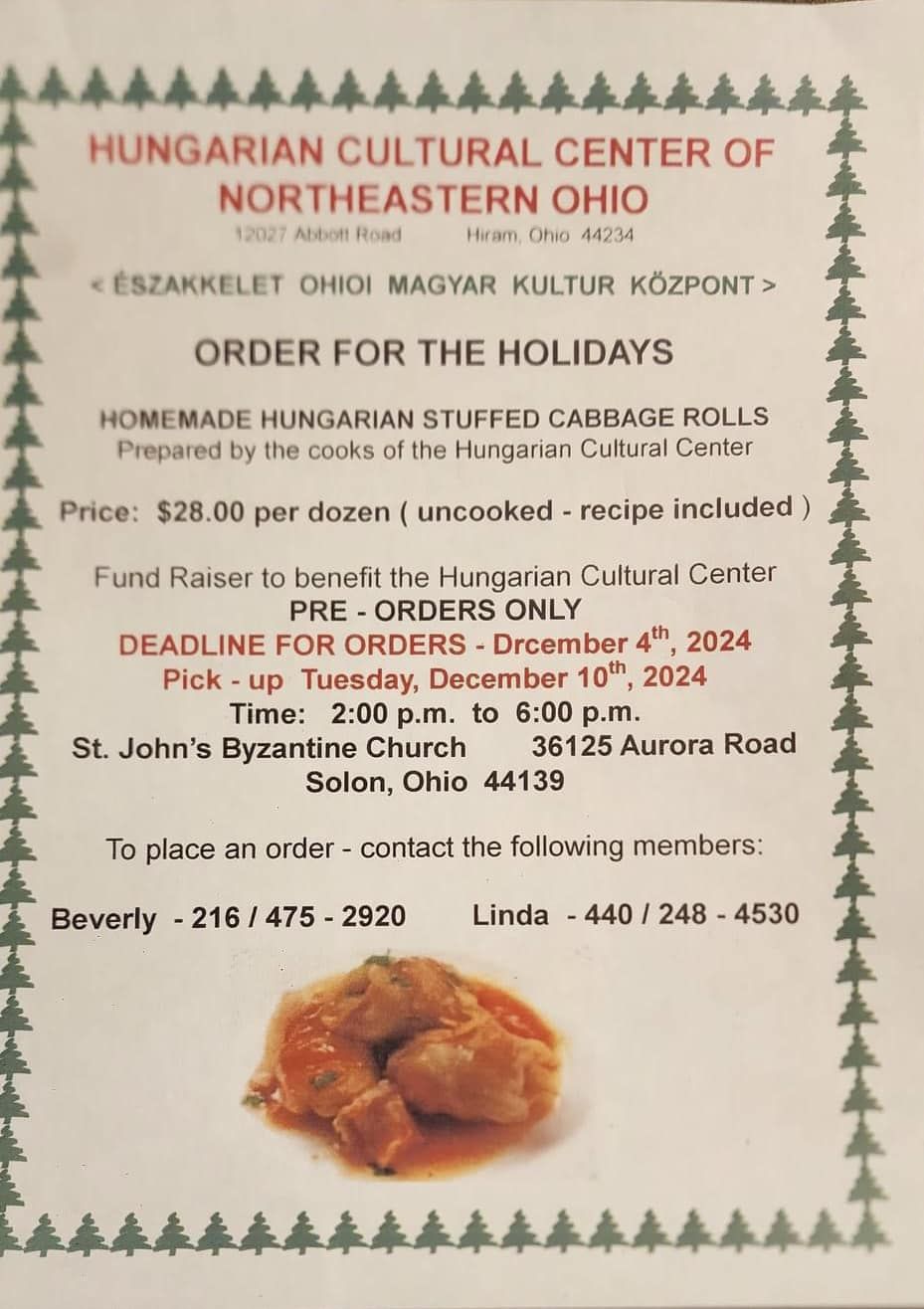 Az Észak-kelet Ohio-i Magyar Kultúrközpont töltött káposztát készít az ünnepekre. A töltelékeket főzetlenül vehetik fel december 10-én a Szent János Görögkatolikus templomban délután 2 és 6 óra között. A templom címe 36125 Aurora Road Solon, Ohio 44139. A főzéshez útmutatást adnak a rendelések átvételekor. Rendeléseiket megtehetik december 4-ig Beverlynél a 216-475-2920-as telefonszámon vagy Lindánál a 440-248-4530-as számon. Az töltött káposzta rendelésével a hirami Magyar Klubbot támogatják.
