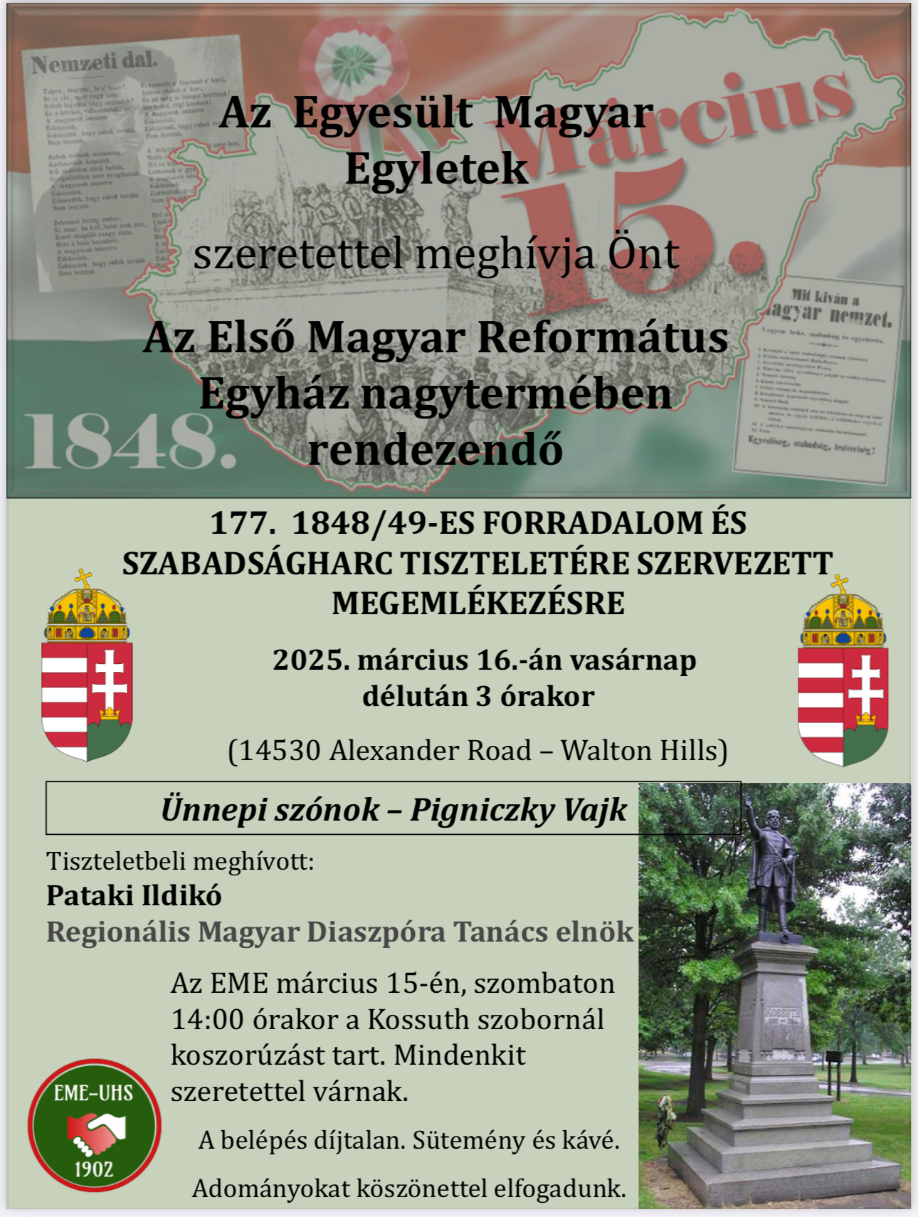 The United Hungarian Societies cordially invite you to the annual Commemoration of the 1484/49 Revolution, which will be held on Sunday, March 16 at The First Hungarian Reformed Church Bethlen Hall, starting at 3 P.M. This event will be mainly in Hungarian. There will also be a ceremonial wreath laying at the Kossuth statue on Saturday, March 15 at 2 P.M. Join us!