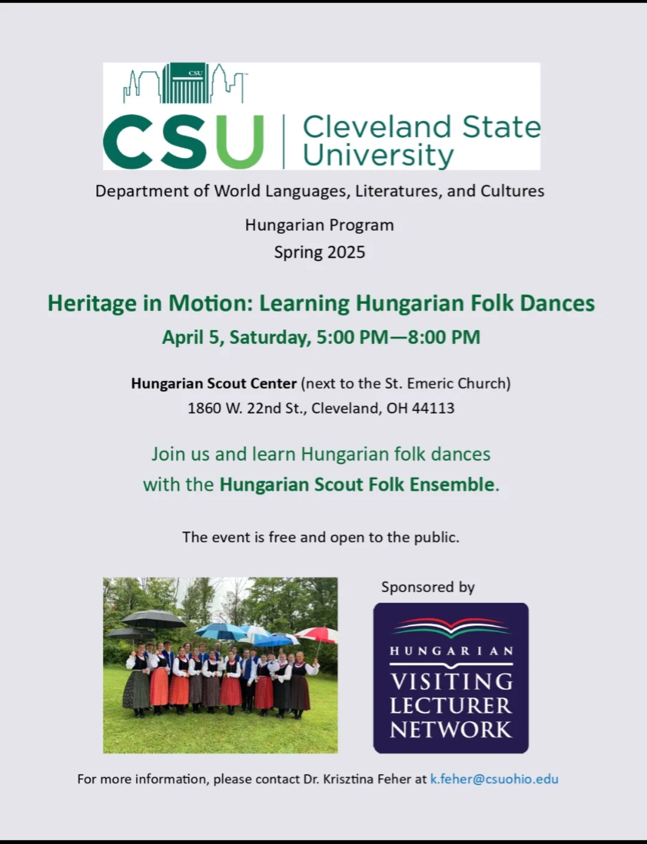 A Cleveland State Egyetem Magyar Programja szeretettel meghív minden érdeklődőt „Örökségünk mozgásban” című ingyenes néptáncestjére április 5.-én, szombat délután 5 órától este 8 óráig. A helyszín a Magyar Cserkészház nagyterme, a Szent Imre templom mellett, mely címe: 1860 West 22nd Street, Cleveland, Ohio, 44113. A magyar táncokat a Cserkész Regős Néptáncegyüttes tagjaitól tanulhatják meg a résztvevők. A program ingyenes, és mindenkit nagy szeretettel várnak! Találkozzunk, táncoljunk és éljük át együtt a magyar néptánc örömét! További információkért keressék Dr. Fehér Krisztinát a következő e-mail címen: k.feher@csuohio.edu