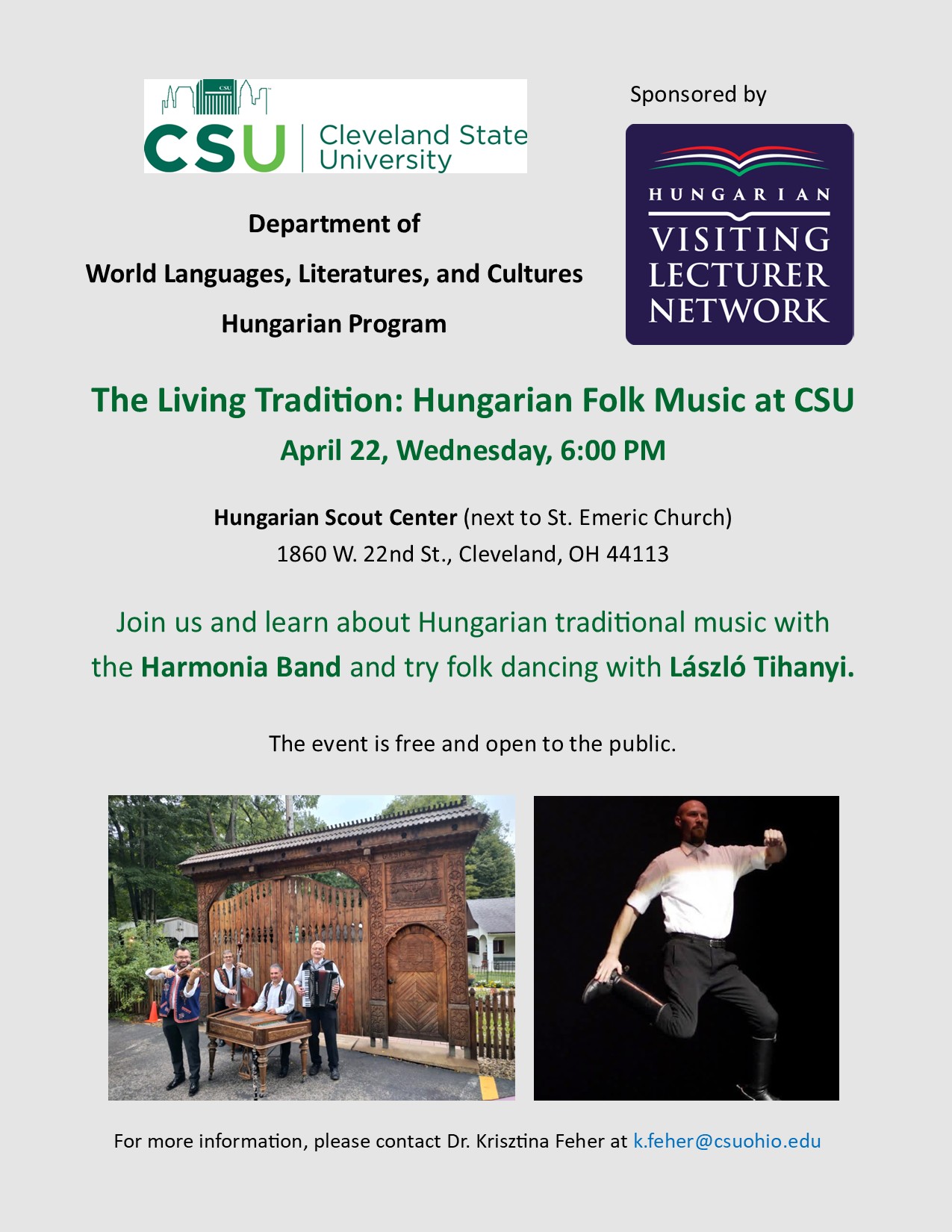 The program, titled “The Living Tradition: Hungarian Folk Music at Cleveland State University”, centers on music. It consists of three parts: a short presentation by members of the Harmonia Band on Hungarian folk music, including music, songs, and instruments; a folk music concert; and a folk dance workshop and performance led by László Tihanyi, artistic director of the Hungarian Scout Folk Ensemble. The program is scheduled for the evening of April 22 at the Hungarian Scout Center. Admission is free and open to all.