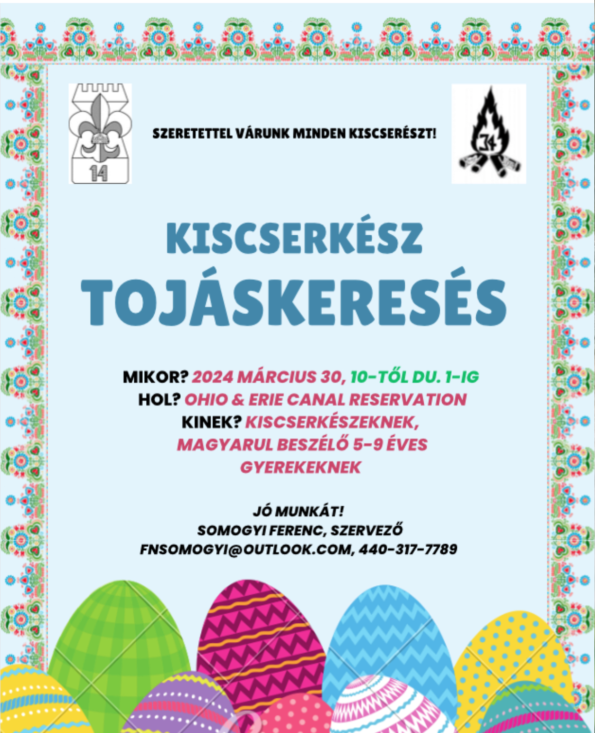 Please join the Hungarian Scout Easter Egg Hunt on Saturday, March 30 from 10 A.M. to 1 P.M. at Ohio & Erie Canal Reservation. The invitation is open to all Hungarian speaking children between the ages of 5-9. For further information, please contact Ferenc Somogyi at fnsomogyi@outlook.com or 440-317-7789.