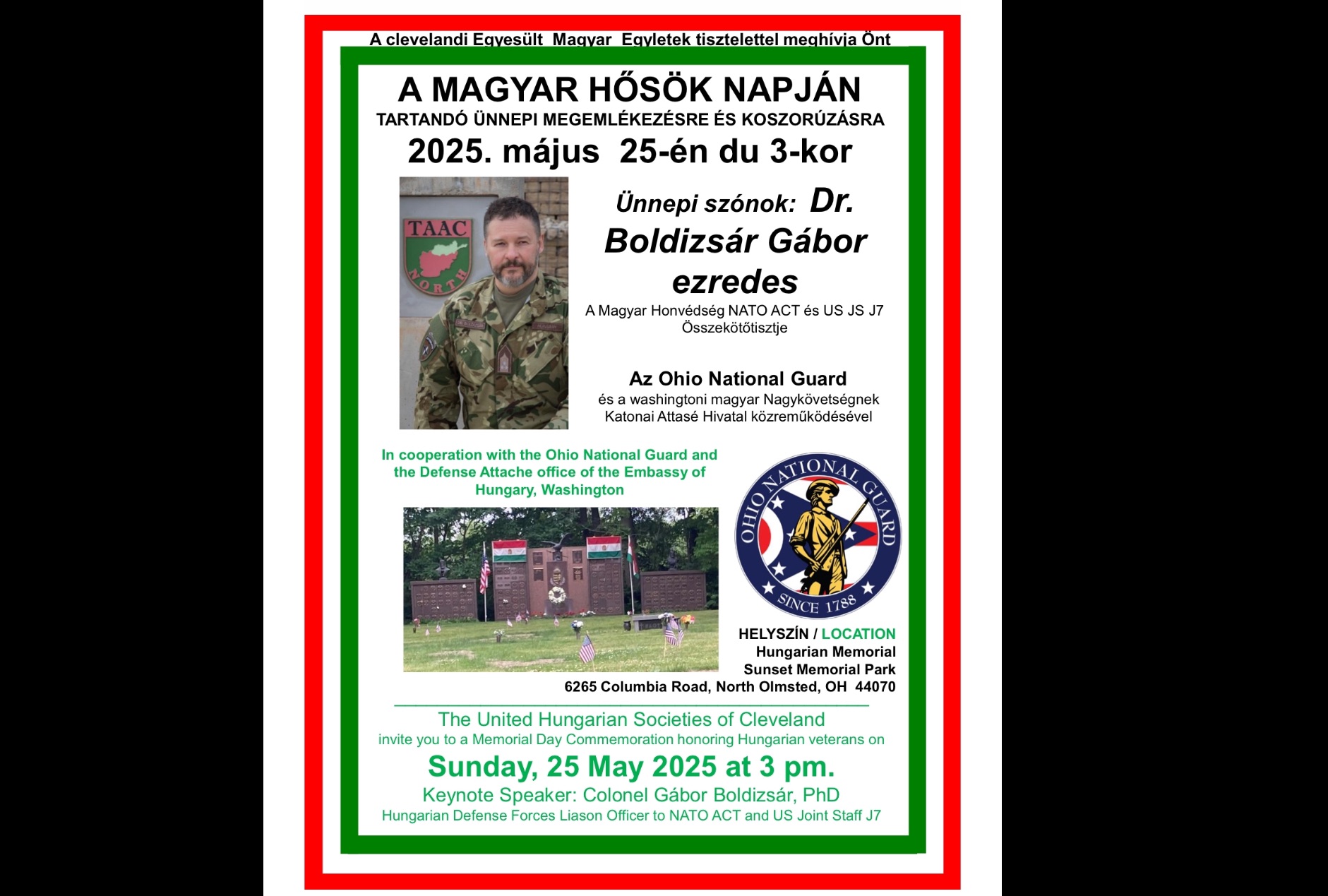 UHS cordially invite you to join the Memorial Day Commemoration Event honoring Hungarian Veterans on Sunday, May 25th at 3:00 P.M. at Sunset Memorial Cemetery (Hungarian Memorial). Keynote Speaker will be Colonel Gábor Boldizsár, PhD. Please consult the attached flyer for additional information. Hope to see you there!