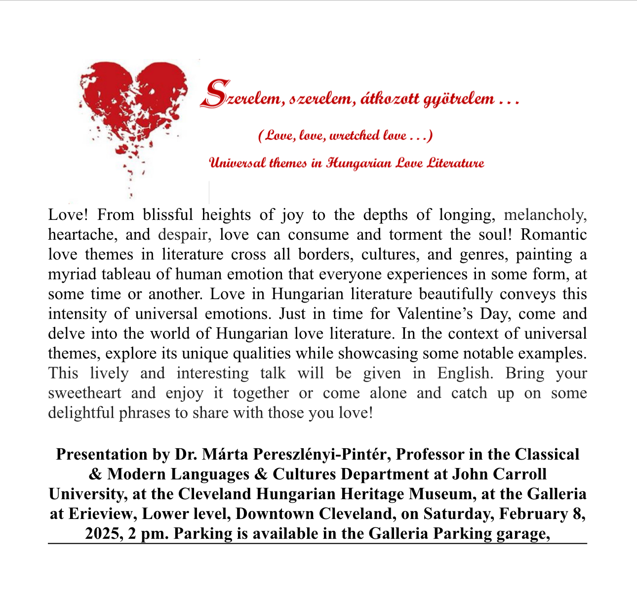 Love! From blissful heights of joy to the depths of longing, melancholy, heartache, and despair, love can consume and torment the soul! Romantic love themes in literature cross all borders, cultures, and genres, painting a myriad tableau of human emotion that everyone experiences in some form, at some time or another. Love in Hungarian literature beautifully conveys this intensity of universal emotions. Just in time for Valentine’s Day, come and delve into the world of Hungarian love literature. In the context of universal themes, explore its unique qualities while showcasing some notable examples. This lively and interesting talk will be given in English. Bring your sweetheart and enjoy it together or come alone and catch up on some delightful phrases to share with those you love! Presentation by Dr. Márta Pereszlényi-Pintér, Professor in the Classical & Modern Languages & Cultures Department at John Carroll University, at the Cleveland Hungarian Heritage Museum, at the Galleria at Erieview, Lower level, Downtown Cleveland, on Saturday, February 8, 2025, 2 pm. Parking is available in the Galleria Parking garage.
