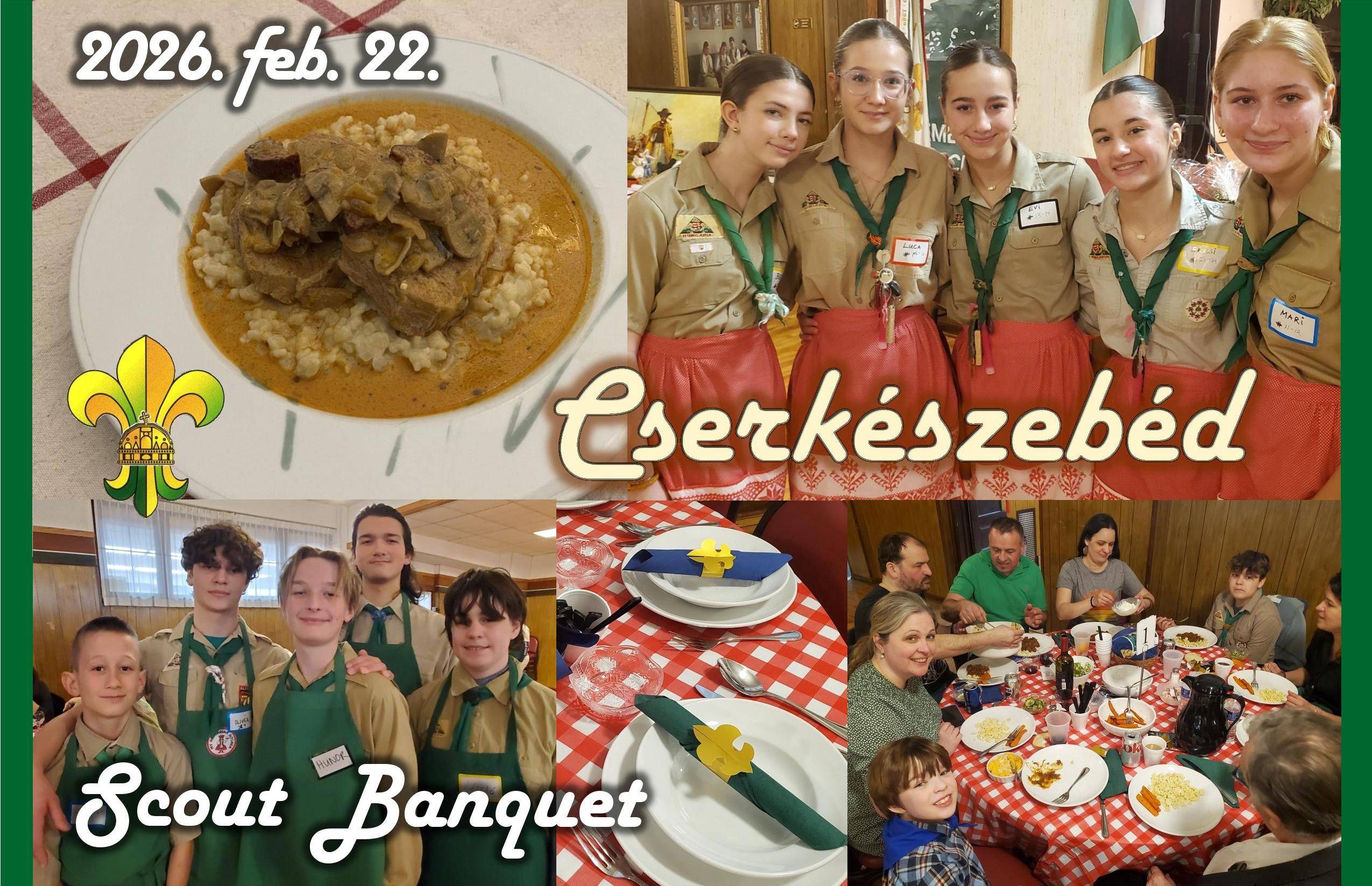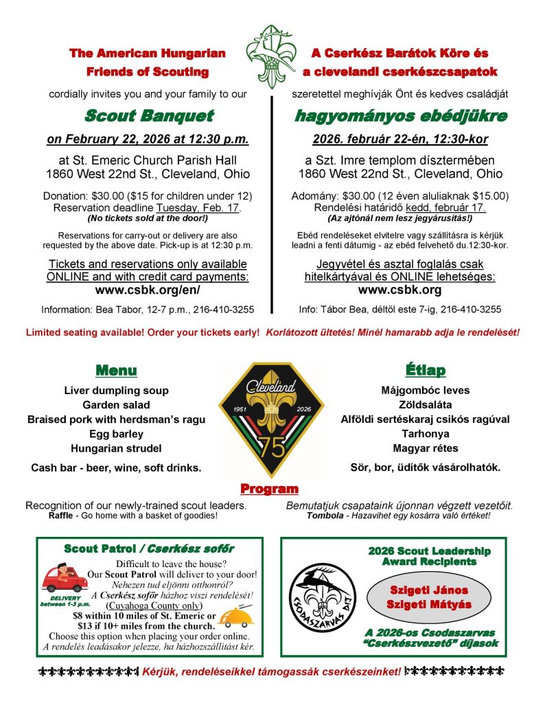 The American Hungarian Friends of Scouting cordially invites you and your family to our Scout Banquet on Sunday, February 22, 2026, at 12:30 p.m., at the St. Emeric Church Parish Hall. The menu includes Hungarian mushroom soup, stewed beef in red wine, spaetzle and garlic roasted carrots, Cucumber salad and chocolate rum square for dessert. Cash bar will have beer, wine, and soft drinks available. Donation is $30.00 ($15 for children under 12). Reservations must be made by Tuesday, February 17. During the luncheon we will recognize our newly trained scout leaders and our Scout Leadership Award recipients and celebrate the 75th anniversary of Hungarian scouting in Cleveland. Also, you may go home with a basket of goodies at our raffle! For complete details see the invitation below.
