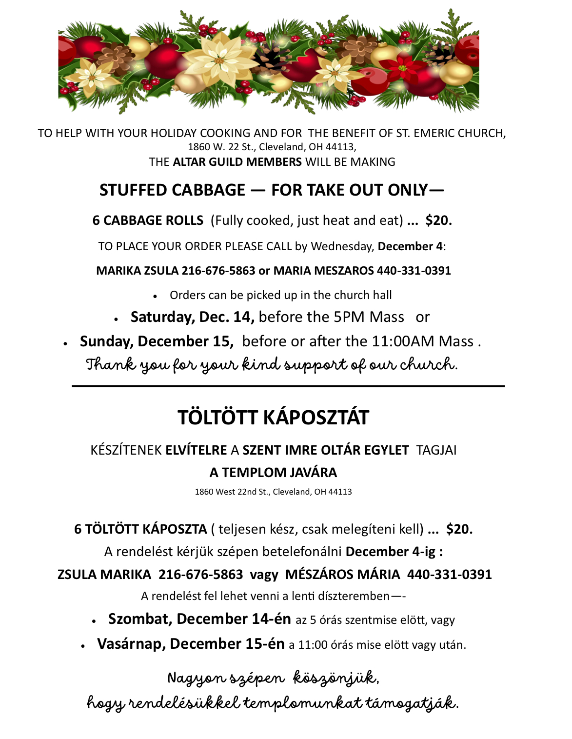 Stuffed Cabbage available for take-out. Please order by Dec. 11 by calling Zsula Marika at 216-676-5863 or Mészáros Mária at 440-331-0391. Please see flyer for additional details and times for pickup.
