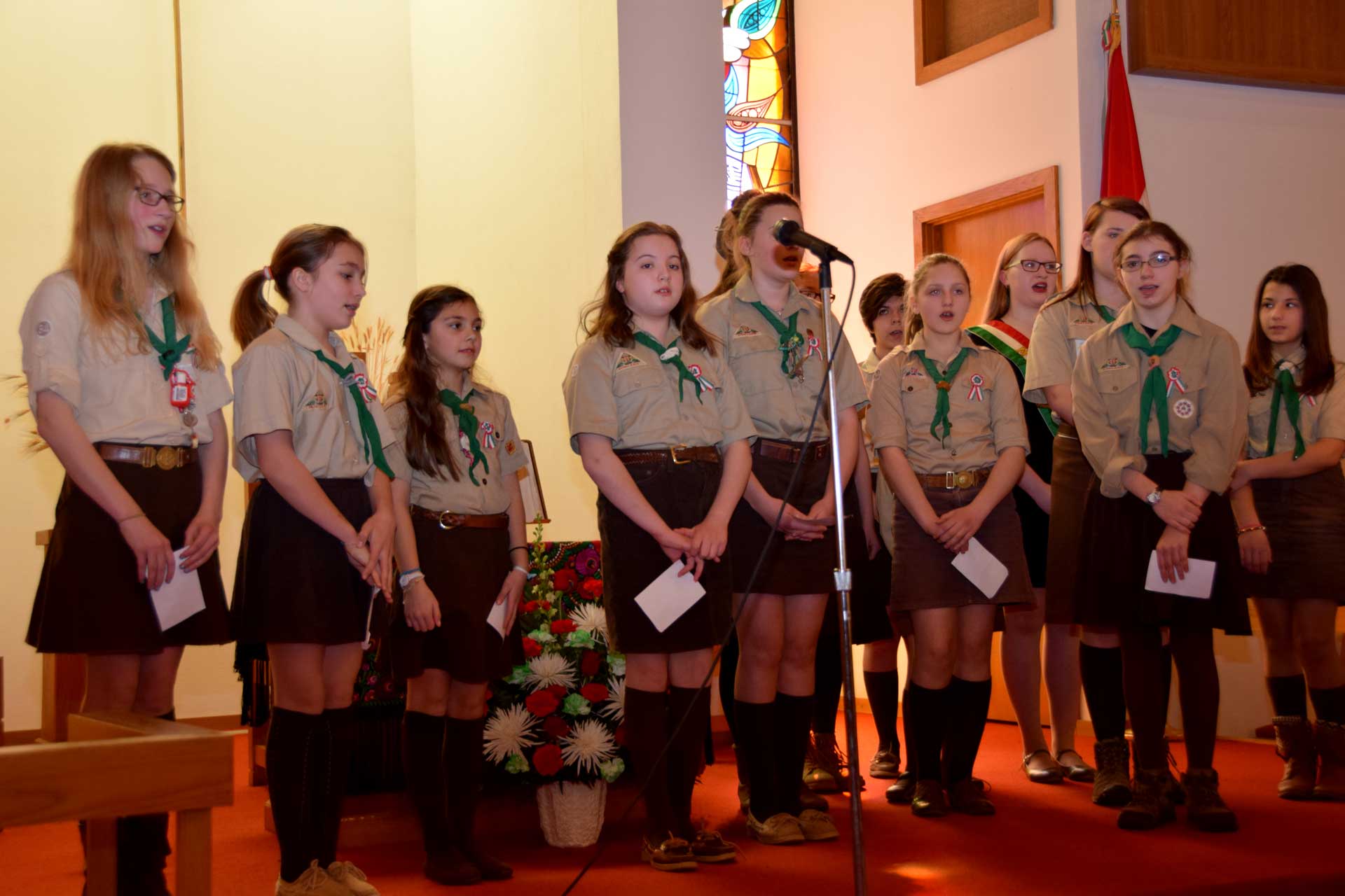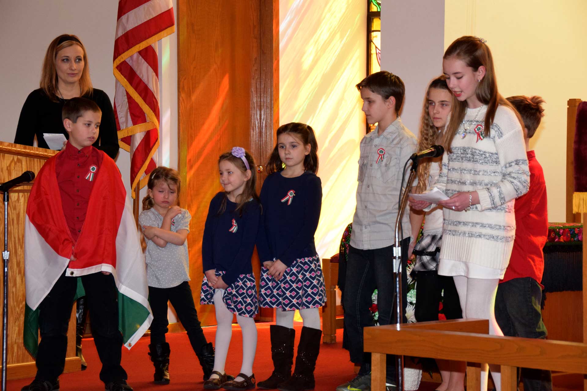 About 220 loyal Hungarians came out of hibernation and gathered together this past sunny but cool Sunday at the West Side Hungarian Reformed Church, to commemorate the Hungarian Revolution of 1848. The program started with the singing of American and Hungarian anthems accompanied on the organ by Marton Tamasy. The opening prayer was said by Rev. Eva Tamasy, from the West Side Hungarian Lutheran Church. The program’s mistress of ceremonies was Hanna Szentkiralyi, a representative of the World Federation of Hungarian Veterans as well as a member of Hungarian Girl Scout Troop #34. Participants in the program included the Sunday school pupils of the First Hungarian Reformed Church, the youth group of the West Side Hungarian Reformed Church, Hungarian Girl Scout Troop 34, the “Kis Magyar Korus” (Little Hungarian Chorus) and the traditional